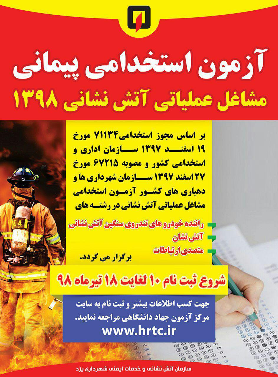 به استناد سهمیه استخدامی شماره ۷۱۱۳۰۴ مورخ ۱۳۹۷/۱۲/۱۹ سازمان اداری و استخدامی کشور و مجوز شماره ۲۲۵۷ مورخ ۱۳۹۸/۰۱/۲۵ سازمان شهرداری‌ها و دهیاری‌های كشور، به منظور تامین نیروی انسانی مورد نیاز مشاغل آتش‌نشانی شهرداری‌های سراسر کشور، آزمون استخدامی كتبی و عملی برای انتخاب افراد واجد شرایط بر اساس مندرجات دفترچه راهنما برگزار می‌گردد.