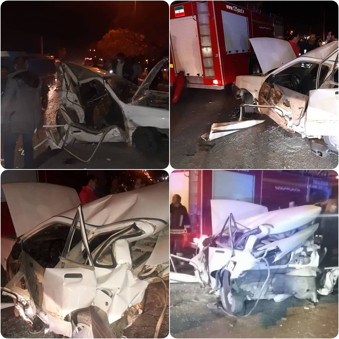 به گزارش روابط عمومی سازمان آتش نشانی و خدمات ایمنی یزد طی گزارشی از سوی شهروندان به سامانه 125 و اطلاع تصادف شدید پژو ۲۰۶ و پراید و محبوس شدن سرنشینان آن  در بلوار استقلال حوالی میدان شهدای نصرآباد در ساعت ۲۱:۳۶ مورخ ۲۳ بهمن  بلافاصله نجاتگران ایستگاه ۵،۳و ۸ به محل اعزام شدند.