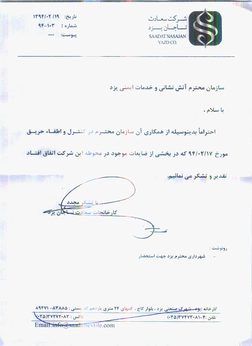 به گزارش روابط عمومی سازمان آتش نشانی و خدمات ایمنی شهرداری یزد در پی حریق انبار روباز در محوطه کارخانه سعادت نساجان در مورخ 17/02/94و سرعت عمل آتش نشانان در مهار و جلوگیری از وارد آمدن خسارات مالی بیشتر به این شرکت ، مدیر کارخانه در پیامی به مدیر عامل این سازمان مراتب تقدیر و تشکر خود را از عملكرد خوب آتش نشانان اعلام نمود .