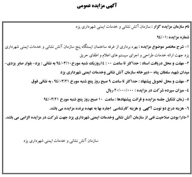 -7دارا بودن صلاحیت فنی از سازمان آتش نشانی وخدمات ایمنی شهرداری یزد جهت شرکت در مزایده الزامی می باشد.