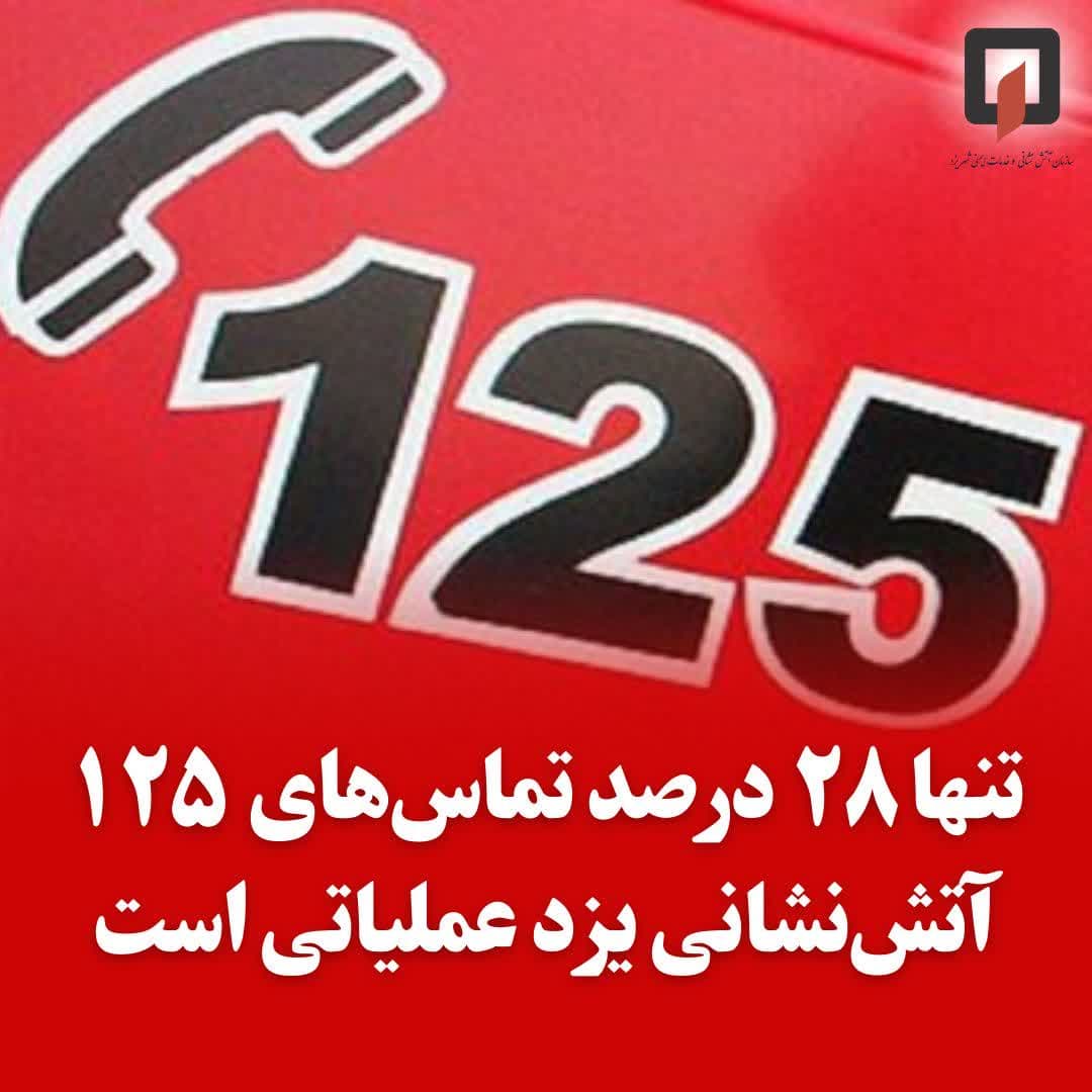 🔸️معاون عملیات سازمان آتش نشانی و خدمات ایمنی شهرداری یزد با بیان اینکه روزانه بین ۴۰۰ تا ۷۰۰ تماس با سامانه ۱۲۵ برقرار میشود، گفت: تنها ۲۸ درصد تماسها عملیاتی هستند.