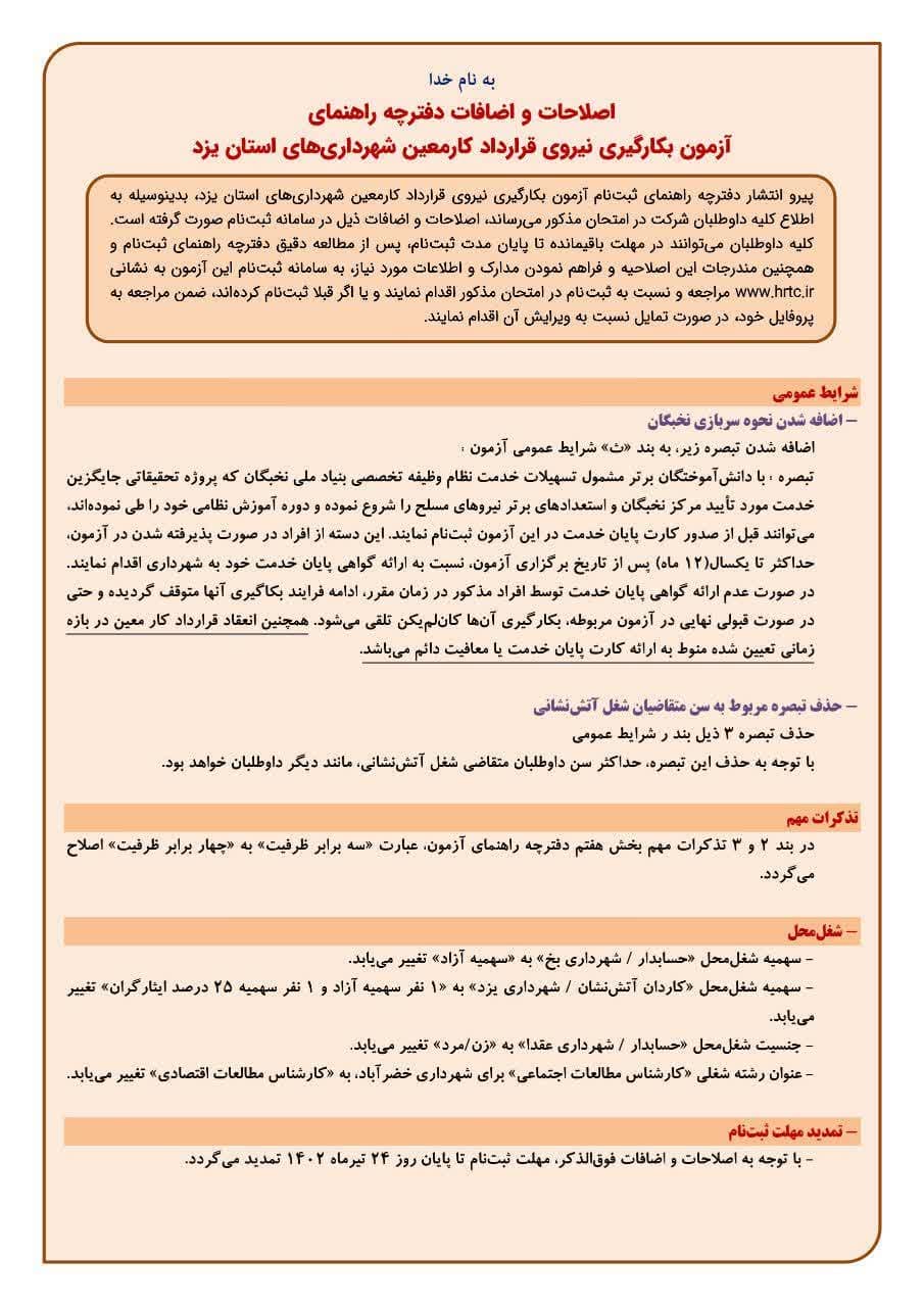 اصلاحات و اضافات دفترچه راهنمای آزمون استخدامی نیروی قرار داد کار معین شهرداری های استان یزد