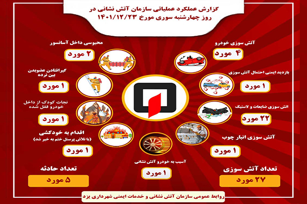 رئیس سازمان آتش نشانی و خدمات ایمنی شهرداری یزد گفت: در چهارشنبه سوری آخر امسال مجموعا 27 مورد آتش سوزی در سطح شهر یزد رخ داده است.